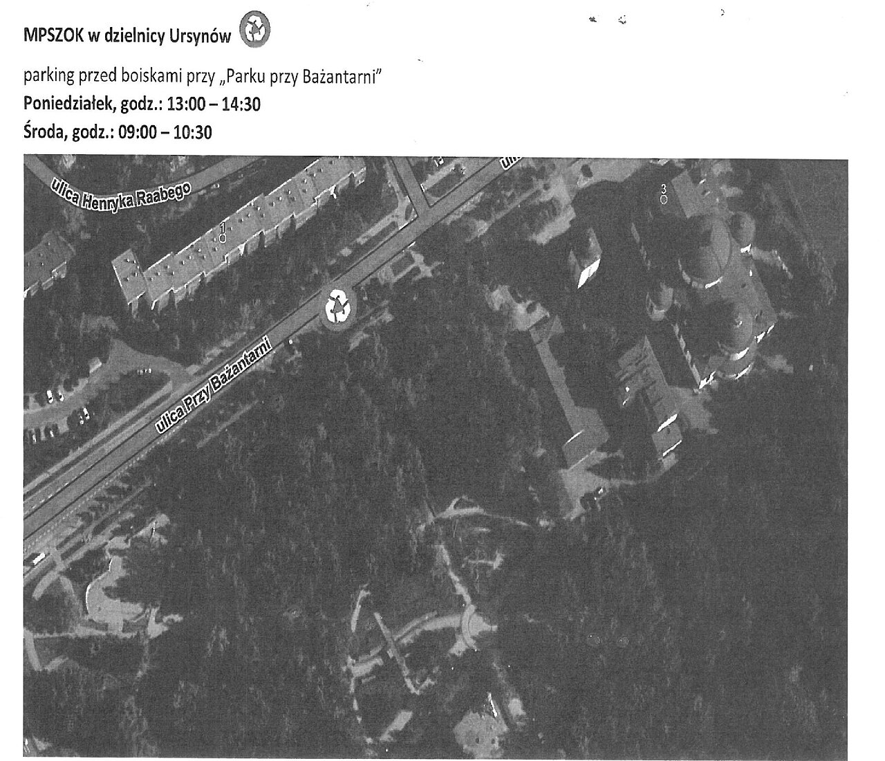 W poniedziałki od godziny 11:00 do 12:30 i w soboty, poza dniami ustawowo wolnymi od pracy, w godzinach 11:00 - 12:30 MPSZOK parkuje na parkingu przy Urzędzie Dzielnicy al. KEN 61.