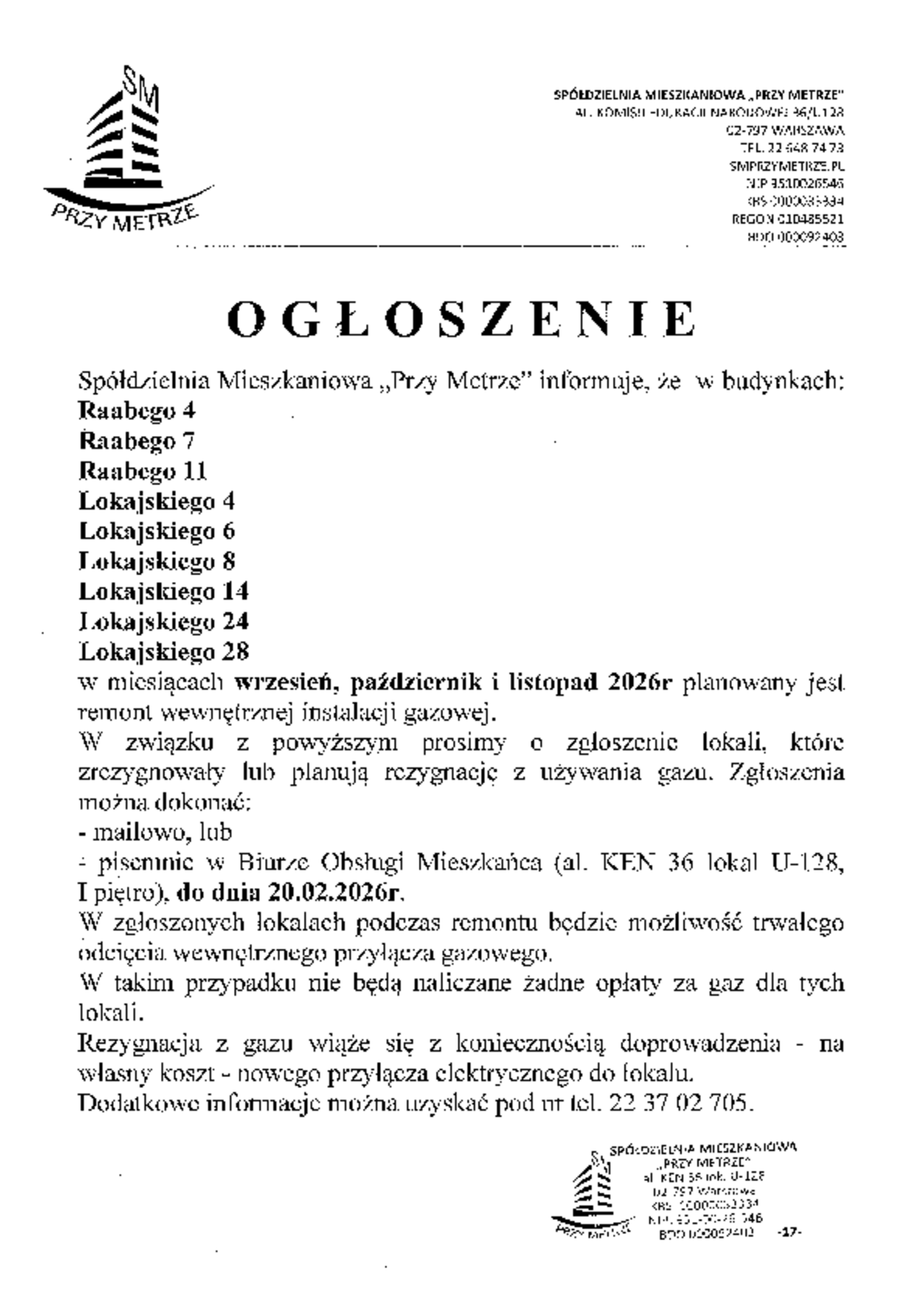 Spółdzielnia Mieszkaniowa „Przy Metrze” zawiadamia, że w budynkach:
