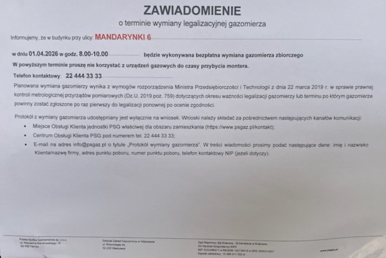 Polska Spółka Gazownictwa (PSG) zawiadamia, że w dniu 01.04.2026 w godzinach 8:00 - 10:00 w budynku przy ul.Mandarynki 6 będzie wykonywana wymiana gazomierza zbiorczego. W powyższym terminie nie należy korzystać z urządzeń gazowych.